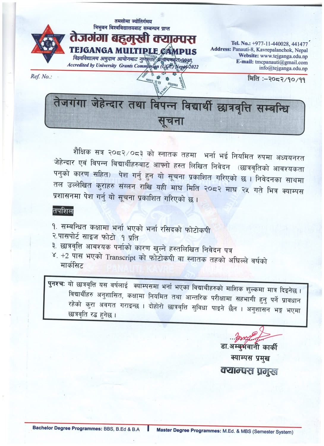 Education is the backbone of human civilization. Keeping, this fact into mind, Tejganga Multiple Campus (TMC), was established at Panauti, Kavre from the public level in 2057 B.S. The college is affiliated to TU and HSEB in the faculties of Education, Management and Humanities since 2058 B.S. The campus has the commitment of providing quality and practical education in complete disciplined and academic environment by the qualified and experienced lecturers. The campus has run Master’s level classes from the help and suggestion of all the well-wishers and the academicians since 2067 B.S.